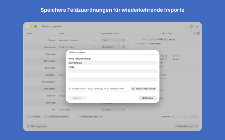 Als ein einfach zu bedienender CSV zu iCal Konvertierer kommt Importer for Calendar mit vielen durchdachten Funktionen. Du kopierst deine Daten aus deiner Tabellenkalkulation einfach in die Zwischenablage und fügst sie dann in Importer for Calendar ein. Du kannst Feldzuordnungen für wiederkehrende Importe sichern, so dass das Zuweisen nicht jedesmal von vorn vorgenommen werden muss. Du kannst das Konvertierungsergebnis vor dem Import in einer Vorschau überprüfen, wobei dir eine Listenansicht oder eine detaillierte Einzelvorschau pro Ereignis zur Verfügung steht. Für die Zusammenarbeit mit Drittanbieter-Kalendern wie Fantastical oder BusyCal kannst du die konvertierten Ereignisse einfach als .ics-Datei sichern. Die App kann mit einer Vielzahl von Datums-, Zeit- und Zeitdauerformaten umgehen und unterstützt auch das Anlegen von Hinweisen (Alarmen).
