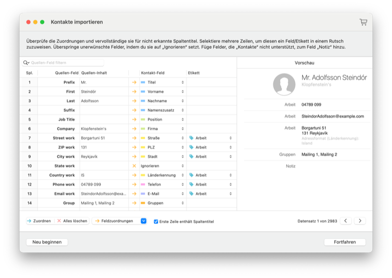 Kontakte importieren ist eine Mac-App, die Excel-Dateien, CSV-Dateien und Tabulator-getrennte Dateien in